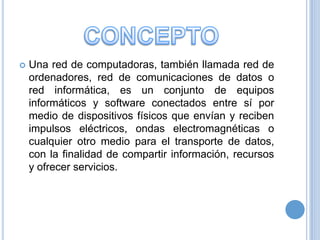 El documento describe los componentes básicos de una red de computadoras, incluyendo cables, tarjetas de interfaz de red, servidores, estaciones de trabajo y recursos compartidos. Explica que las redes se rigen por modelos como OSI e TCP/IP y que utilizan diferentes tipos de cables como coaxial, de par trenzado y de fibra óptica para transmitir datos.