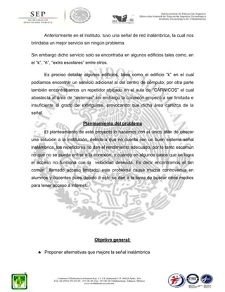 El documento describe las deficiencias de la red inalámbrica en un instituto técnico. Explica que la señal es irregular y de baja calidad, lo que dificulta el uso de Internet para estudiantes y profesores. El objetivo es mejorar la red mediante la identificación de áreas sin cobertura, mantenimiento de equipos existentes, e instalación de nuevos puntos de acceso y repetidores siguiendo estándares internacionales. El proyecto beneficiaría a los 5,000 estudiantes y 600 profesores del instituto al facilitar