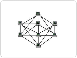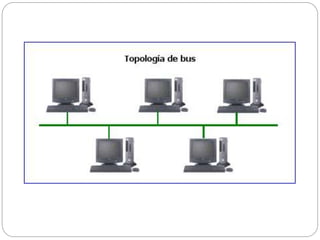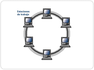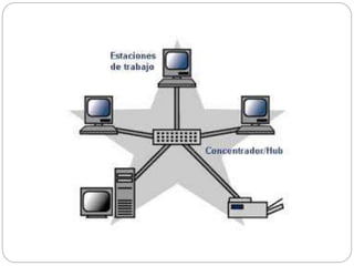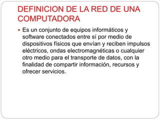 Este documento define las redes de computadoras y describe sus principales componentes y tipos. Explica que una red es un conjunto de equipos interconectados que comparten recursos e información. Luego describe los tipos de redes como LAN, WAN, MAN e inalámbricas, así como las principales topologías como estrella, bus, árbol, malla y anillo. Finalmente, detalla los componentes clave de una red como servidores, estaciones de trabajo, tarjetas de interfaz y cables, así como protocolos y recursos compartidos.