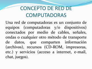 Una red de computadoras conecta equipos como computadoras y dispositivos a través de cables, señales u ondas para compartir información, recursos y servicios. Existen diferentes tipos de redes como las redes de área local (LAN), las redes de área amplia (WAN) y las redes inalámbricas (WLAN), las cuales se diferencian por el área geográfica que cubren.