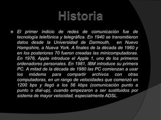 El documento describe la historia y evolución de las redes de comunicación desde las primeras redes telefónicas y telegráficas hasta el desarrollo de Internet. Explica que una red está compuesta de hardware como computadoras, servidores y dispositivos de red, así como software como sistemas operativos y aplicaciones que permiten la interconexión y compartición de recursos entre los dispositivos. Finalmente, detalla algunos componentes hardware clave como las tarjetas de red y adaptadores que permiten que las computadoras se comuniquen a través de diferentes medi