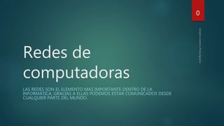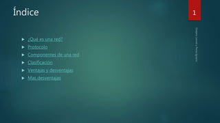 Una red es un conjunto de dispositivos interconectados que comparten recursos e información. Las redes usan protocolos como TCP/IP para transmitir datos. Los componentes clave de una red incluyen hardware como placas de red y switches, y software que establece protocolos de comunicación. Las redes se clasifican por su área de cobertura, como LAN, MAN, WAN. Proporcionan ventajas como compartir hardware y archivos, pero también riesgos como pérdida de privacidad y seguridad debido a virus, spyware, hackers y spam.
