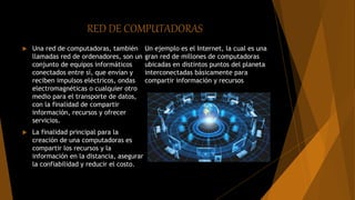 Una red de computadoras conecta equipos informáticos para compartir información y recursos. Las redes se clasifican por alcance, tipo de conexión, topología física y grado de autenticación. Internet es una red descentralizada de redes interconectadas que permite el acceso remoto a información y servicios a través de protocolos como HTTP y correo electrónico.
