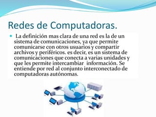 Las redes de computadoras son sistemas de comunicación que conectan dispositivos para permitir el intercambio de información y recursos. Estas redes se pueden construir mediante diversos métodos de transporte de datos, como cables y señales. El internet se define como un conjunto descentralizado de redes que utilizan protocolos TCP/IP para operar como una única red global.