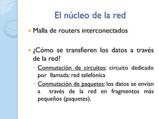 Este documento describe los fundamentos de las redes de computadoras e Internet. Explica las dos formas principales de transferir datos a través de una red: conmutación de circuitos y conmutación de paquetes. También describe la estructura de las redes troncales de Internet y los proveedores de servicios de Internet.