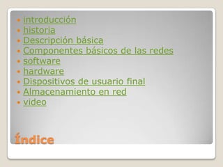 Este documento describe las redes de computadoras, incluyendo su historia, componentes básicos y tipos. Explica que una red permite compartir información entre equipos conectados a través de dispositivos físicos. Detalla los elementos hardware y software necesarios, así como dispositivos de usuario final comunes como computadoras, impresoras y almacenamiento en red.
