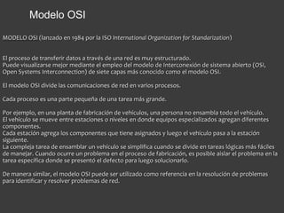 El documento describe el modelo OSI y cómo divide el proceso de transferencia de datos a través de una red en siete capas. Explica que cada capa se encarga de un proceso específico, como empaquetar los datos, agregar direcciones, convertir los datos a bits, etc. De esta forma, la compleja tarea de transferir datos a través de una red se simplifica en tareas más simples y específicas manejadas por cada capa.