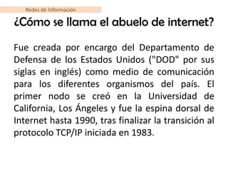 El ARPANET fue creado por el Departamento de Defensa de EE.UU. en la década de 1960 como red de comunicaciones. Google Earth, lanzado en 2005, permite ver imágenes de satélite y mapas de cualquier lugar del planeta. Un nodo es un punto de intersección o unión en una red como un servidor o computadora.