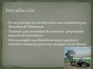 Este documento presenta la creación de una comunidad de líderes de bibliotecas con el objetivo de identificar y fortalecer las competencias de liderazgo entre los bibliotecarios. La comunidad busca compartir experiencias e información para crear y divulgar conocimiento a través de presentaciones, paneles, publicaciones y proyectos de investigación. Se discutirán los retos que enfrentan los directores de bibliotecas y cómo pueden desarrollar servicios y proyectos a pesar de agendas cargadas y burocracia. La comunidad está re
