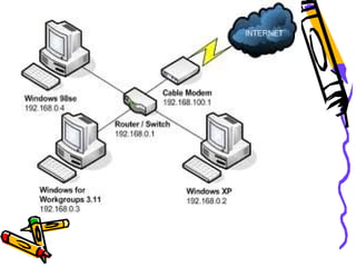 Este documento describe las redes de área local (LAN). Explica que una LAN permite compartir recursos como archivos, hardware e Internet entre ordenadores cercanos. Detalla los tipos de arquitecturas de red, dispositivos comunes como routers y switches, y los protocolos TCP/IP. También resume los pasos para instalar una LAN, incluyendo la selección de dispositivos, configuración de direcciones IP y conexión a Internet.