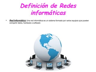 Un documento define una red informática como un sistema formado por equipos que comparten datos, hardware o software. Describe tres tipos de redes: LAN, WAN y MAN. Luego detalla dispositivos comunes como switches, adaptadores de red, routers y puntos de acceso que se usan en una red LAN, y cómo suelen conectarse en una configuración en estrella. Finalmente, explica cómo configurar una red manualmente e identificar la dirección IP de un ordenador.