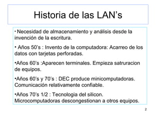 Este documento describe la historia y los componentes clave de las redes de área local (LAN). Explica que las LAN surgieron en los años 80 para permitir el compartimiento de recursos como impresoras y archivos entre computadoras cercanas. Detalla los principales componentes de una LAN, incluyendo servidores, estaciones de trabajo, tarjetas de red, cableado, sistemas operativos de red y protocolos de comunicación. Finalmente, define una LAN como un sistema de comunicación que proporciona interconexión de dispositivos a gran velocidad dentro de