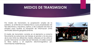MEDIOS DE TRANSMISIÓN GUIADOS Y NO GUIADOS: Los medios guiados como el cable de par trenzado, coaxial y fibra óptica utilizan componentes físicos para la transmisión de datos a través de un cable. Los medios no guiados como las ondas de radio, microondas, infrarrojos y luz no utilizan un cable, sino que las señales se propagan a través del medio. Cada medio tiene ventajas y desventajas dependiendo de su ancho de banda, capacidad de transmisión, costo e inmun