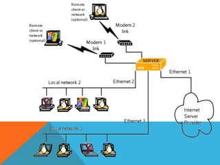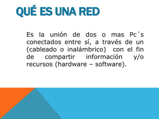 Una red es la unión de dos o más computadoras conectadas entre sí para compartir información y recursos. Las redes permiten compartir información, hardware y software, y centralizar la administración. Ofrecen beneficios como el intercambio de recursos, comunicación entre personas y procesos, acceso universal a la información, y videojuegos multijugador. Existen diferentes tipos de redes clasificadas por su configuración y cobertura geográfica, como las redes LAN, MAN y WAN.
