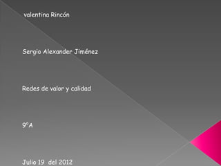 El documento habla sobre las redes de valor y calidad. Explica que las redes de valor internas se basan en la confianza y el acuerdo entre los participantes, mientras que las redes externas requieren un mejor manejo de la información debido a un contacto más limitado. Además, clasifica las redes de valor según el grado de conocimiento en redes estables, donde siempre se conoce la marca del producto, y redes incrementales, donde surgen nuevas marcas con frecuencia.