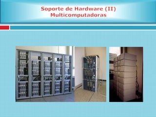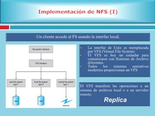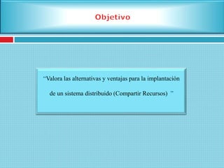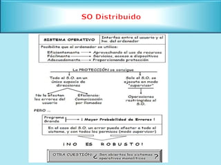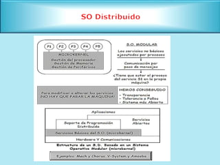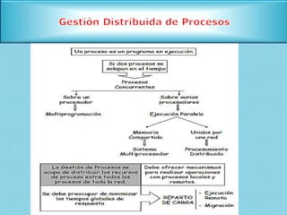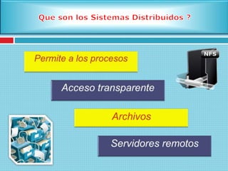 Este documento describe los sistemas distribuidos y sus componentes principales. Explica las estructuras de los sistemas distribuidos como los sistemas operativos de red, los sistemas operativos distribuidos y los servicios remotos. También describe los componentes clave como los sistemas de archivos distribuidos y la gestión distribuida de procesos.