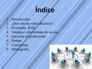 Este documento describe las redes docentes y la plataforma Procomún. Explica que las redes docentes son plataformas donde los profesores comparten recursos e información. Procomún es una red social profesional que ofrece más de 200 comunidades y 8500 recursos educativos abiertos. El documento también discute las ventajas como compartir valores y mejorar la educación, y las desventajas como falta de formación y contenidos no accesibles a estudiantes.
