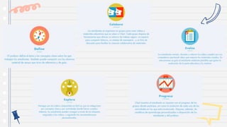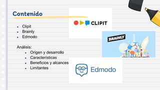 El documento analiza tres plataformas educativas: Clipit, Brainly y Edmodo, resaltando sus características, beneficios y limitaciones. Clipit es una red social que promueve el aprendizaje audiovisual entre estudiantes, Brainly fomenta la colaboración en la resolución de tareas escolares, mientras que Edmodo facilita la comunicación y gestión educativa entre docentes y alumnos. Cada plataforma presenta ventajas como la interacción colaborativa y el aprendizaje activo, pero también enfrenta limitaciones en su accesibilidad y usabilidad.