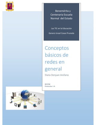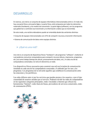 Este documento describe los conceptos básicos de las redes, incluyendo qué es una red, los tipos de redes, la topología, los componentes y los medios físicos de una red. Explica que una red es un conjunto de dispositivos interconectados que permiten compartir recursos y transmitir información, y que existen diferentes tipos de redes según su alcance geográfico como LAN, MAN, WAN. También describe las principales topologías de red como anillo, estrella y bus, así como los componentes de hardware y software necesarios para una red.