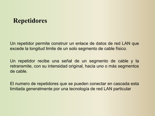 Un repetidor permite extender la longitud de un segmento de red al recibir una señal y retransmitirla a otros segmentos, operando en la capa física del modelo OSI. Un puente conecta dos o más subredes LAN al enviar tramas entre ellas de forma transparente a las capas superiores, operando en la subcapa de control de acceso al medio de la capa de enlace de datos. Un switch conecta ordenadores o redes de forma selectiva sólo cuando es necesario, funcionando en el nivel 2 del modelo OSI.