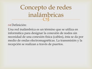 Este documento describe los conceptos básicos de las redes inalámbricas. Define una red inalámbrica como una conexión de nodos sin cables mediante ondas electromagnéticas. Explica que Wi-Fi, HomeRun y Bluetooth son tipos comunes de redes inalámbricas, y que Wi-Fi es la más utilizada actualmente para conectar dispositivos a Internet de forma inalámbrica.