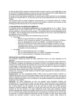 Este documento describe las redes inalámbricas, incluyendo definiciones, tipos de redes, estándares como Wi-Fi e IEEE 802.11, y comparaciones de velocidad entre redes alámbricas e inalámbricas. También discute las ventajas de las redes inalámbricas como movilidad, flexibilidad y ahorro de costos, así como las desventajas como menor ancho de banda, mayores costos iniciales, interferencias y preocupaciones de seguridad. El documento concluye que a pesar de las des