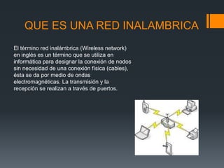Este documento resume tres tipos de redes inalámbricas: Wi-Fi, Bluetooth y WLAN. Explica que Wi-Fi ofrece banda ancha a través de una antena ubicada en el domicilio del cliente, mientras que Bluetooth permite la transmisión de voz y datos entre dispositivos cercanos a través de radiofrecuencia. Por último, WLAN es un sistema inalámbrico flexible que se usa como alternativa o extensión de las redes LAN cableadas, permitiendo la comunicación inalámbrica entre equipos asociados.