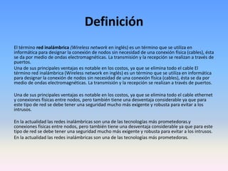 Una red inalámbrica es una red de computadoras que conecta nodos sin el uso de cables, usando ondas electromagnéticas transmitidas a través de puertos. Tiene la ventaja de reducir costos al eliminar cables, pero requiere seguridad más robusta para evitar intrusos. Se clasifican según su cobertura en redes personales, metropolitanas o de área amplia, usando tecnologías como Bluetooth, WiFi, WiMAX y redes celulares.