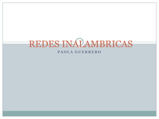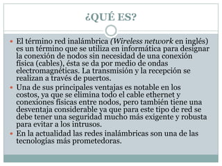 Una red inalámbrica permite la conexión de nodos sin cables mediante ondas electromagnéticas. Tiene ventajas de costo al eliminar cables, pero requiere mayor seguridad contra intrusos. Se explican dos configuraciones típicas de redes inalámbricas domésticas, una usando un router con DHCP y la otra usando direcciones IP estáticas asignadas por el proveedor de internet.