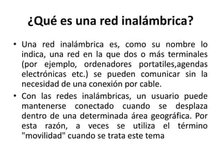 Este documento describe tres tipos principales de redes inalámbricas: WPAN, WLAN y WMAN. WPAN son redes de área personal inalámbricas que usan tecnologías como Bluetooth y ZigBee para conectar dispositivos electrónicos dentro del hogar. WLAN son redes inalámbricas locales que usan radiofrecuencia para proporcionar una alternativa cableada o extensión de redes LAN. Finalmente, WMAN permiten conexiones inalámbricas entre varios edificios de una ciudad o campus sin el alto costo de