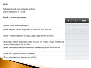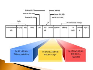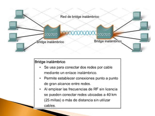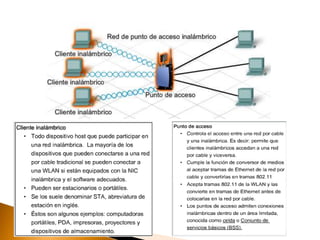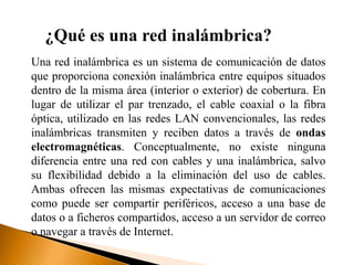 Una red inalámbrica permite la conexión inalámbrica entre equipos dentro de un área de cobertura utilizando ondas electromagnéticas en lugar de cables. Las redes inalámbricas ofrecen las mismas funciones que las redes cableadas pero con mayor flexibilidad y movilidad al eliminar la necesidad de cableado. Existen varios estándares como 802.11 que especifican las tecnologías inalámbricas como Wi-Fi para garantizar la interoperabilidad.