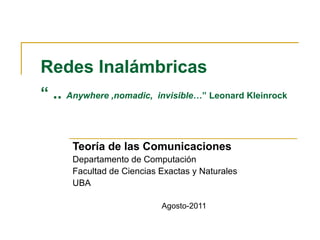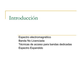Este documento resume las principales características de las redes inalámbricas. Explica que el espectro electromagnético está dividido en bandas con diferentes anchos de banda y frecuencias, y que las bandas ISM no requieren licencia. Describe las técnicas de acceso múltiple FDMA, TDMA y CDMA, y las técnicas de espectro expandido FHSS y DSSS. Finalmente, resume las normas 802.11, explicando sus características, configuraciones, problemas como la estación oculta y