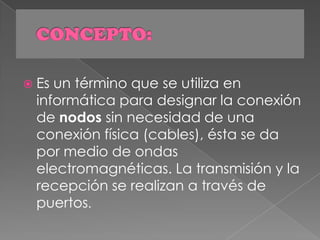 Las redes inalámbricas permiten la conexión entre nodos sin necesidad de cables mediante ondas electromagnéticas. Ofrecen mayor comodidad que las redes cableadas al permitir la conexión desde distintos puntos dentro de un área. Existen diferentes tipos de redes inalámbricas como las redes personales, de área local y metropolitanas que usan tecnologías como Wi-Fi, Bluetooth, ZigBee y WiMAX.