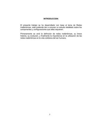 Este documento proporciona una introducción a las redes inalámbricas. Explica brevemente la historia de las redes inalámbricas, los diferentes tipos con sus respectivas normas, las ventajas de estas redes, y cómo configurar y conectar una red inalámbrica de forma segura.