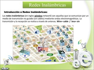 Este documento proporciona una introducción a las redes inalámbricas, incluidos los estándares y protocolos principales como 802.11b, 802.11a, 802.11g y 802.11n. Explica cómo funcionan las redes inalámbricas de forma similar a las redes Ethernet pero usando ondas de radio en lugar de cables, y describe los diferentes estándares y sus velocidades de transmisión.