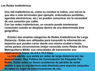 Una red inalámbrica permite que terminales como ordenadores portátiles y agendas electrónicas se comuniquen sin cables. Esto permite que los usuarios se mantengan conectados mientras se mueven dentro de un área geográfica. Existen dos tipos amplios de redes inalámbricas de larga distancia, como redes metropolitanas y redes públicas de conmutación de paquetes por radio.