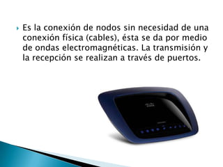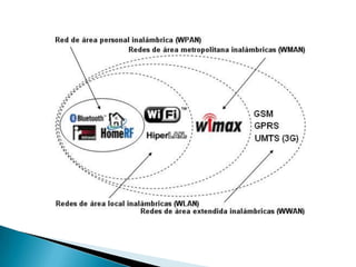 Este documento describe diferentes tipos de redes inalámbricas, incluyendo sus ventajas, desventajas, tecnologías subyacentes y aplicaciones. Discute redes de corto alcance como Bluetooth y ZigBee, redes de área local como Wi-Fi, redes metropolitanas como WiMAX, y redes de área amplia como redes celulares 3G y 4G. También cubre las diferentes bandas de frecuencia del espectro electromagnético utilizadas para la transmisión inalámbrica de datos.