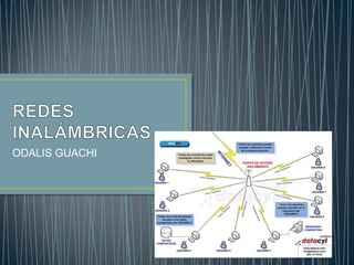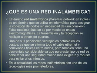 Este documento describe los diferentes tipos de redes inalámbricas, incluyendo redes personales de área (WPAN), redes metropolitanas de área (WMAN) y redes amplias de área (WWAN). También discute los estándares como Bluetooth, WiFi, WiMAX y redes celulares. Explica que las redes se pueden clasificar según su cobertura y el rango de frecuencias utilizado, como ondas de radio, microondas o infrarrojos.