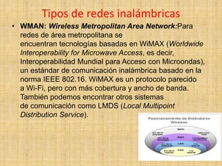 Este documento describe los diferentes tipos de redes inalámbricas como WMAN, WWAN y WLAN, así como sus características, aplicaciones, seguridad, ventajas y bibliografía. Explica que una red inalámbrica permite la conexión de nodos sin necesidad de una conexión física mediante ondas electromagnéticas. Detalla los diferentes estándares y tecnologías utilizadas como WiMAX, UMTS, GPRS, Bluetooth y ZigBee.