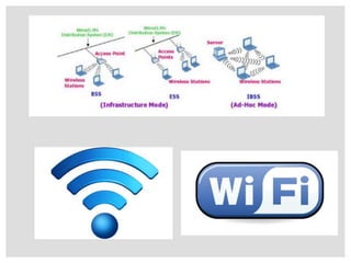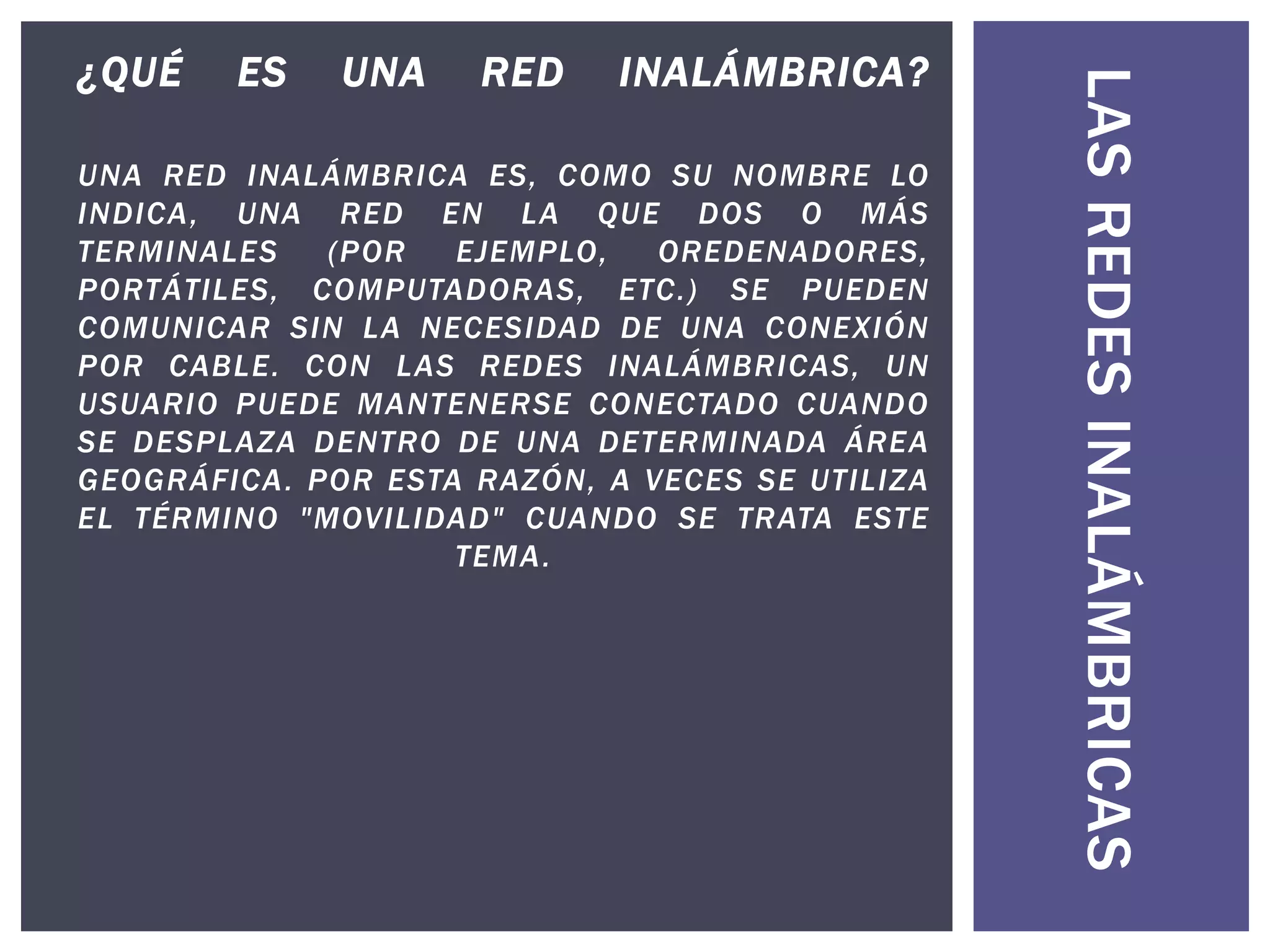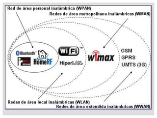 Una red inalámbrica permite que dispositivos como computadoras, teléfonos y tabletas se comuniquen sin cables dentro de un área geográfica. Consiste en un enrutador inalámbrico, adaptadores de red para los dispositivos, y una conexión a Internet. Las redes inalámbricas son fáciles de instalar y más prácticas que las redes por cable, aunque su estabilidad y seguridad pueden ser problemas.