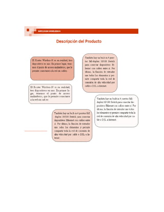 Este documento proporciona información sobre redes inalámbricas. Explica diferentes tipos de redes inalámbricas como PAN (redes de área personal), LAN (redes de área local), MAN (redes de área metropolitana) y WAN (redes de área amplia), e incluye detalles sobre tecnologías como Wi-Fi, Bluetooth, ZigBee, RFID, HiperLAN, WiMAX, LMDS, GPRS y más. También analiza algunos productos inalámbricos existentes en el mercado