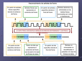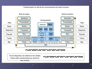 Este documento trata sobre redes de datos e introduce conceptos clave como protocolos, componentes de red, modelos de capas y capa física. Explica que los protocolos establecen reglas para la comunicación, los componentes incluyen dispositivos, medios y protocolos/servicios, y que el modelo OSI describe las capas y flujo de información entre ellas, con la capa física encargada de la representación y transmisión de bits a través de los medios físicos.