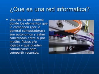 Una red informática conecta computadoras de forma autónoma para compartir recursos. La primera red experimental, ARPANET, se desarrolló en 1969 para conectar universidades y permitir el intercambio de mensajes e información. En 1982, los protocolos TCP/IP permitieron la interconexión de redes y el surgimiento de Internet. Las redes tienen software, hardware y protocolos que permiten la comunicación entre computadoras.