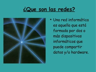 Este documento describe las redes informáticas, incluyendo que son sistemas formados por dos o más dispositivos que comparten datos y hardware, e Internet como la red de redes que usa TCP/IP. Explica los servicios de Internet como correo electrónico y la World Wide Web, las topologías de red como en bus, estrella y anillo, y las diferencias entre redes cliente-servidor y peer-to-peer. También cubre direcciones IP para identificar hosts y dominios de Internet para proporcionar nombres más fáciles de recordar que las direcciones numéricas.
