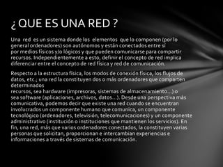 Una red es un sistema donde elementos como ordenadores están conectados entre sí para compartir recursos como hardware y software. Una red física se compone de dos o más ordenadores conectados, mientras que una red de comunicación también involucra personas que intercambian información a través de sistemas de comunicación. Las redes proveen servicios como acceso, archivos, impresión y correo electrónico para que los usuarios compartan recursos e información.