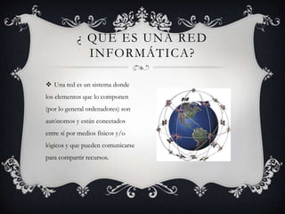 Este documento describe las redes informáticas, incluyendo su definición, ventajas, servicios comunes como acceso, archivos e impresión, y componentes clave como servidores, estaciones de trabajo, software y hardware de red. También cubre diferentes tipologías de redes, topologías como anillo, bus y estrella, y protocolos de red.