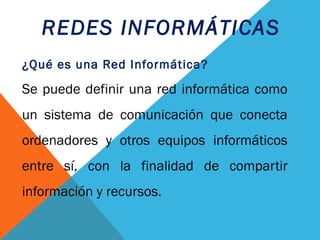 Este documento define una red informática como un sistema de comunicación que conecta ordenadores y otros equipos para compartir información y recursos. Explica las ventajas de las redes como la facilidad de comunicación, reducción de costos y mejoras en la administración. También describe los servicios y equipos comunes en una red como servidores, estaciones de trabajo, tarjetas de red, e instalación física de estas. Finalmente, compara diferentes tipos de redes como LAN, WAN, MAN y CAN.