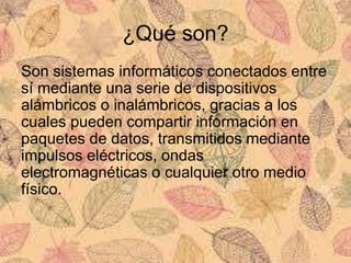 Las redes informáticas son sistemas informáticos conectados que comparten información a través de dispositivos alámbricos o inalámbricos. Existen tres tipos principales de redes: las redes LAN de menor tamaño como las de un locutorio, las redes MAN de tamaño intermedio como las de un campus universitario, y las redes WAN de mayor alcance como Internet. Las redes están compuestas de servidores, clientes, medios de transmisión y elementos de hardware y software.
