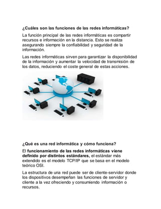 El documento describe los diferentes tipos de redes informáticas según su alcance, como las redes personales, de área local, metropolitanas y amplias. Explica que la función principal de las redes es compartir recursos e información de forma segura. Por último, define una red informática como un conjunto de dispositivos interconectados que intercambian y comparten información y recursos mediante servidores, clientes y elementos de hardware y software.