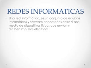 Una red informática es un conjunto de equipos informáticos y software conectados entre sí mediante dispositivos físicos que envían y reciben impulsos eléctricos. Las redes están formadas por conexiones entre grupos de ordenadores y dispositivos asociados que permiten la transferencia electrónica de información entre estaciones de trabajo a través de servidores, cables o líneas telefónicas. Para formar una red se requieren elementos hardware, software y protocolos clasificados en dispositivos de usuario final y dispositivos de red.